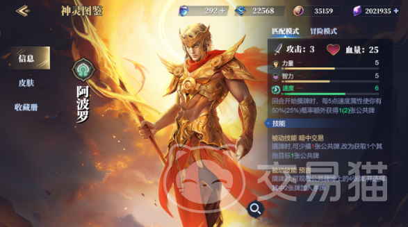 阿波罗的初始攻击力是3点,血量为25,力智速初始为5/5/6,他的被动技“暗中交易”能在摸牌的时候,少摸一张公共牌,更改成获取1个其他目标的公共牌,他的被动技“预言”会在摸牌的时候,可观看公共牌堆上的四张牌,并从中选择两张加入自己的手牌。