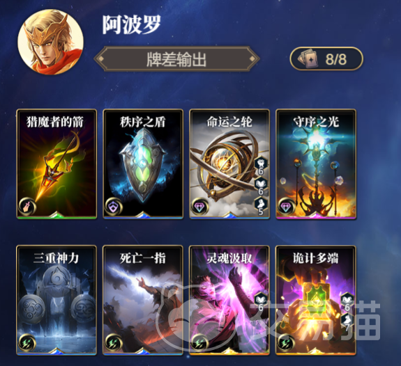 也就是说大家也可以通过这个招式来控制对方是否会被雷电劈,需要注意雷电的判定阶段是在摸牌之前,所以没有办法通过“预言”防止自己被雷电劈,整体来看,阿波罗的两个招式都能用来控制对手的手牌,大家只要在构筑卡组的时候从这方面入手,通过一个个回合的运营,就能慢慢拉开双方手牌的差距,控制住敌方的手牌,慢慢给与对手伤害,主打牌差输出。