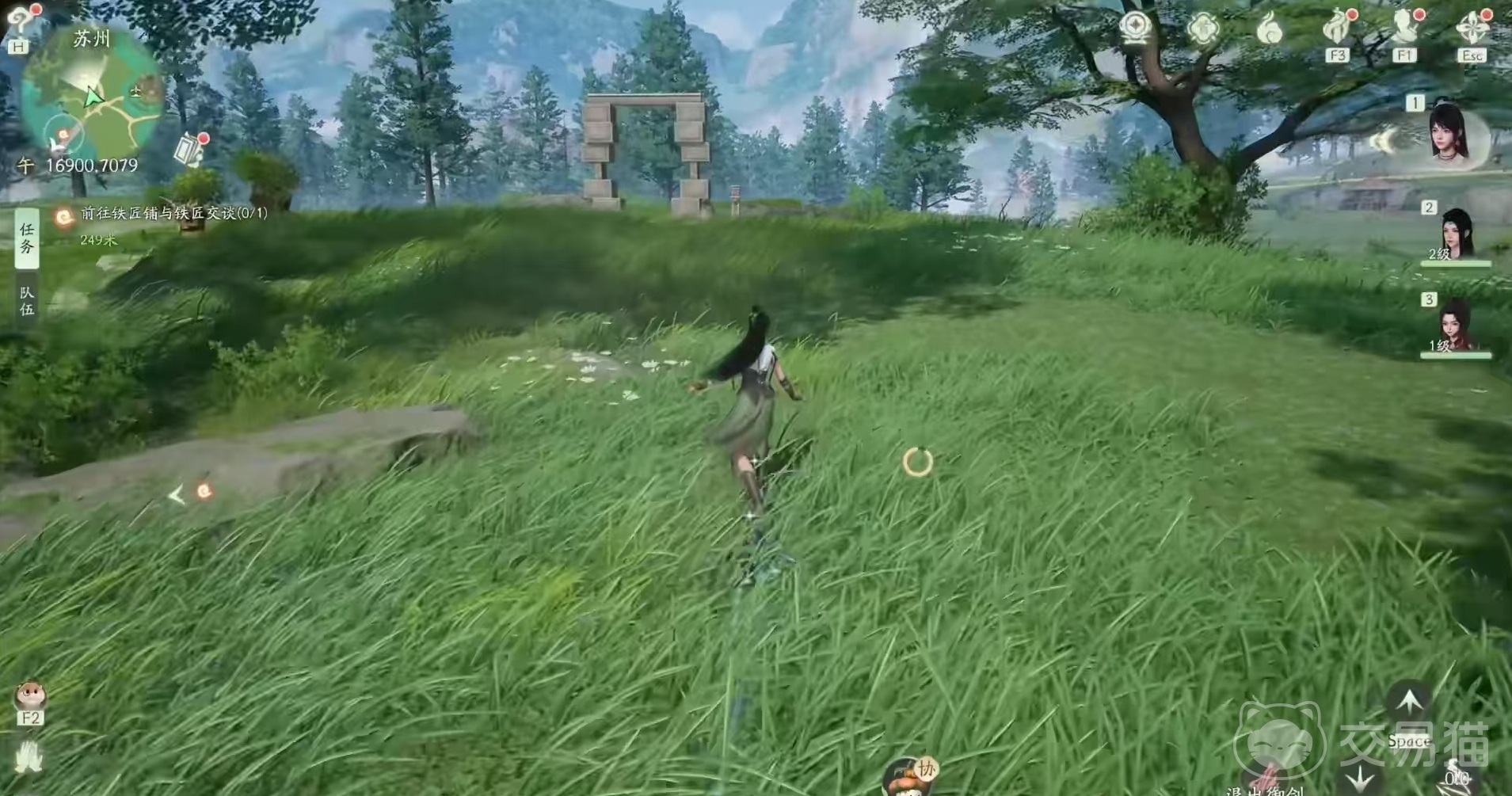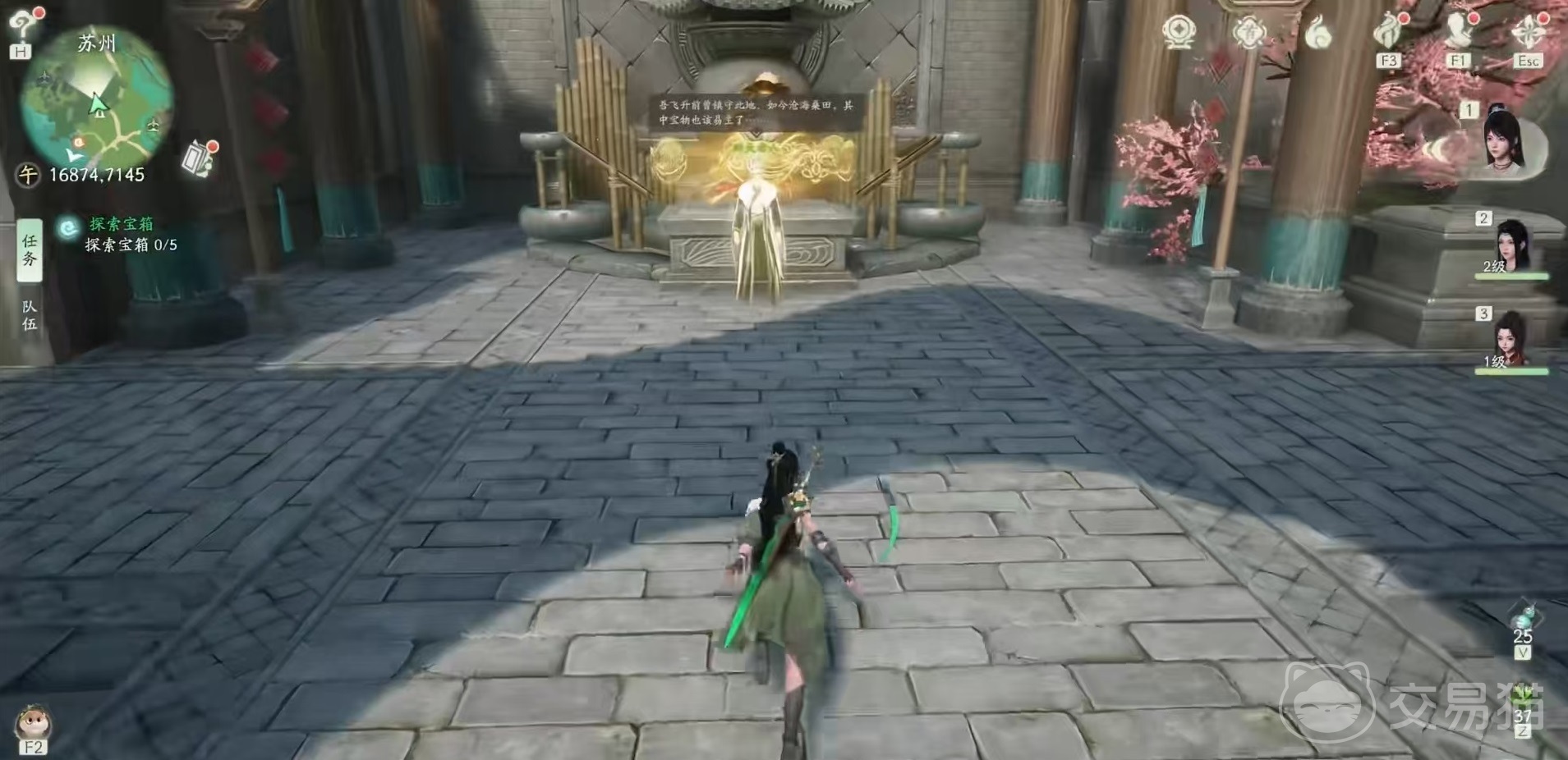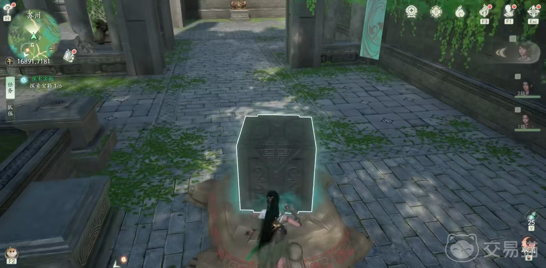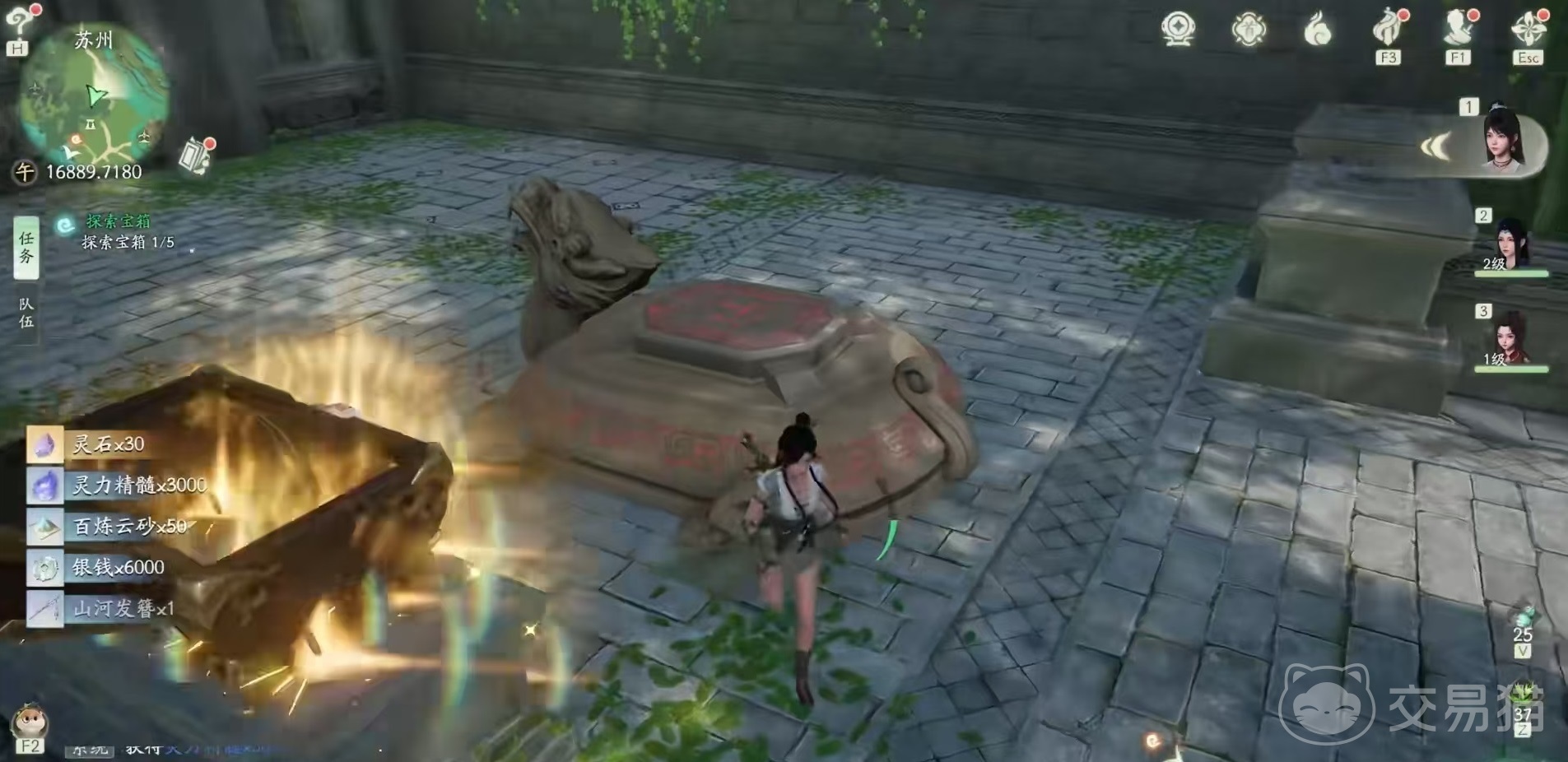 水月洞天的位置是在苏州城外的河边,可以看到很明显的有一个石头门,进入门中,就可以传送到水月洞天,然后开启解谜了。首先进入水月洞天之后先右转,转两次拿到石头,放到乌龟上,就可以将门打开,进门之后在树下开启里面的第1个宝箱,然后再站到旁边的石像上,将上方的石头,用游戏里学会的牵引能力,直接拉过来放到石像上,进去之后打开第2个箱子。