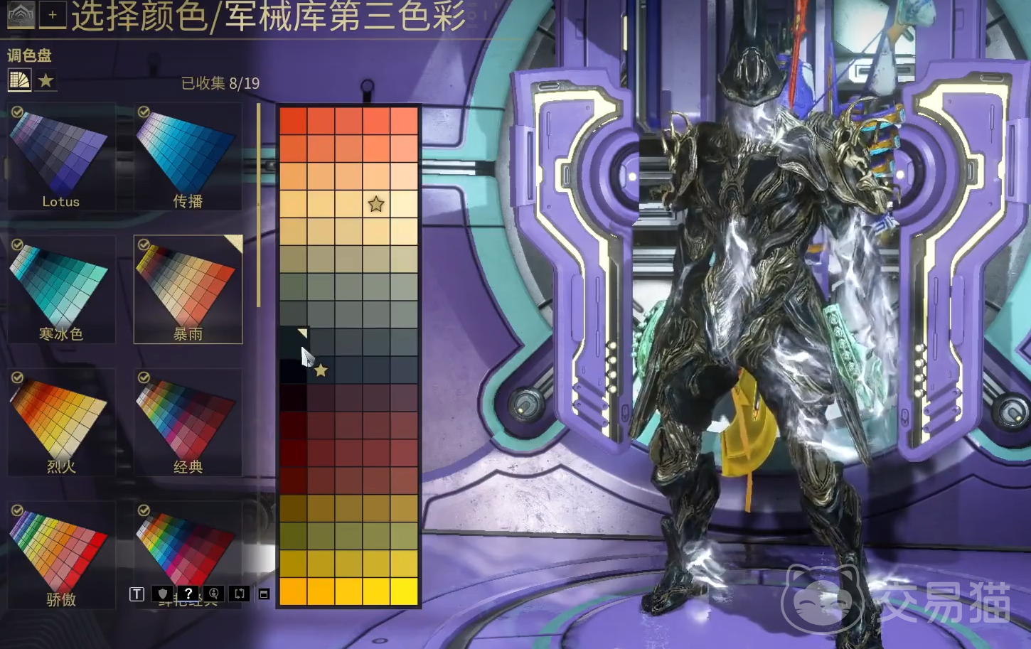 在战甲的详细页面中,玩家可以详细查看并自定义战甲的配色方案。页面上展示了丰富的颜色选项,这些选项包括了主要色彩、次要色彩以及高亮色彩等多种配色选择。玩家可以根据个人的喜好和审美,通过点击不同的颜色块来挑选出最符合自己心意的颜色组合。在挑选过程中,玩家可以实时在预览窗口中观察到战甲在新配色方案下的外观效果。一旦玩家对所选的颜色效果感到满意,便可以通过点击保存按钮,将这些新的配色方案永久应用到战甲上。如果玩家对当前的颜色效果并不满意,他们完全有自由继续尝试和调整不同的颜色组合,直到达到一个让自己完全满意的结果为止。