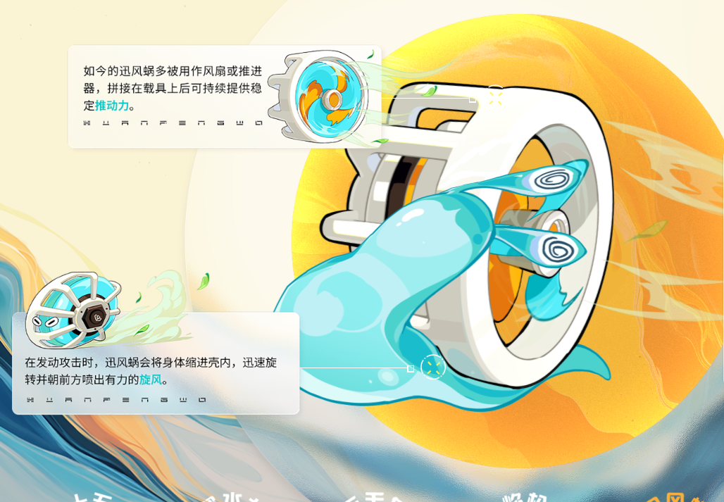 迅风蜗的外形像一只蜗牛,但是于普通蜗牛不一样,它的壳内有一个可以高速转动的风扇,虽然它的动作慢慢悠悠,但是速度很快,它的技能就是向敌人喷射飓风。