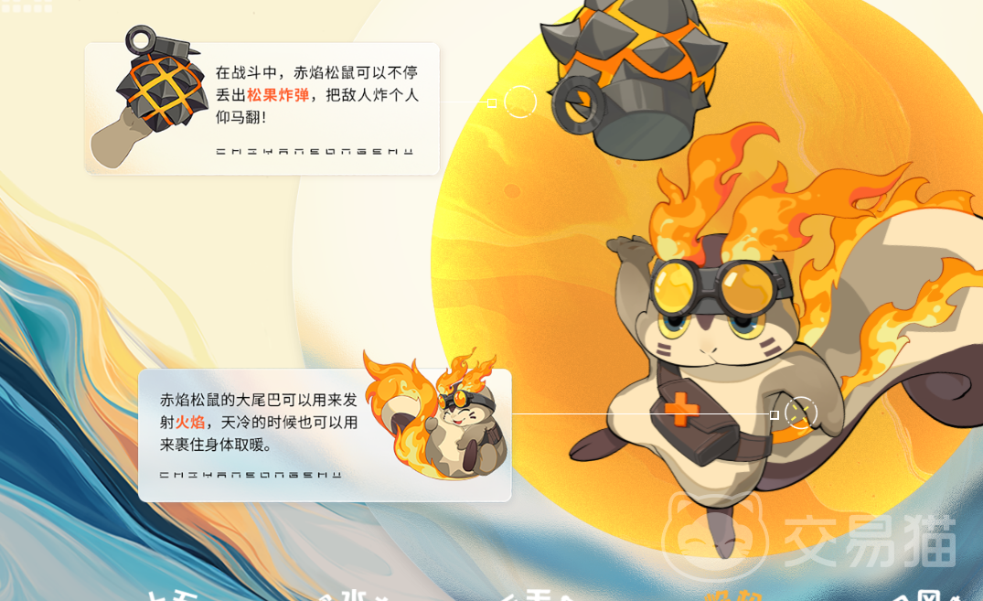 首先出场的视赤焰松鼠,外形像松鼠,它的大尾巴很大很蓬松,蕴藏着火焰的力量,它们也可以把吃的坚果转化成武器,比如它们使出的技能,坚果炸弹,威力十分强大。
