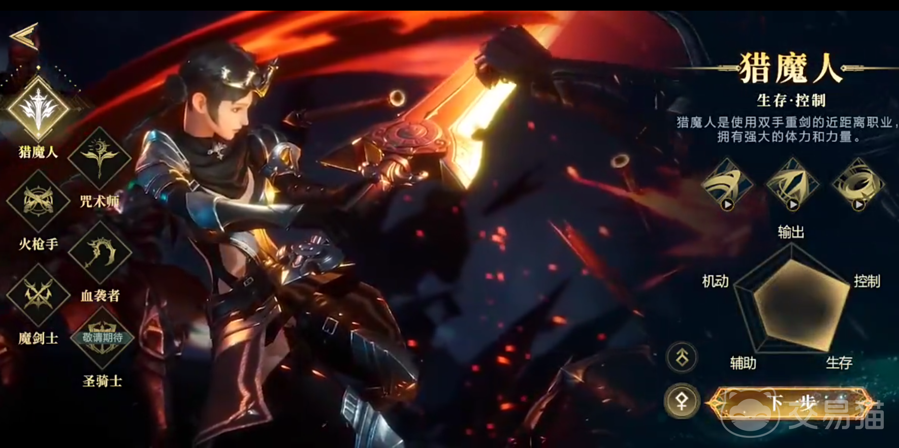 猎魔人的存在就像是定心丸一样,能带给团队无尽的安全感和跟随冲刺的信赖感,作为队伍中的肉盾需要资源不多,主打生存和控制,是使用双手重剑的近战职业,如果大家喜欢对抗,想用自己双手来打破对面的防线,那么他就是最佳选择,他的一技能会挥舞手中的剑,砍出剑气攻击前方矩形范围里的敌人,并使其移动速度降低一段时间;