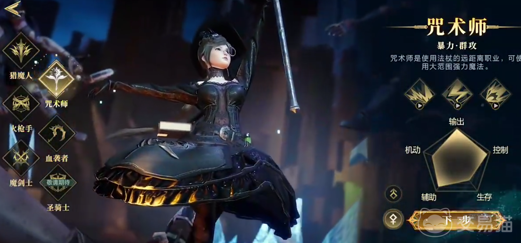 咒术师会手持法杖,在超远距离进行毁灭性打击和控制,如果想要集控制与输出为一体,咒术师就是最适合大家的,他的第一个技能可以召唤落雷形成范围输出值,他的第二个会召唤一个奥术旋涡持续向前推进,对旋涡附近的敌人形成输出值,他的第三个会朝着前方释放出冰封之路,对敌人形成冰冻效果。