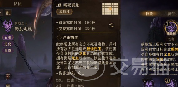 而勒瓦妮丝的终极技能嗜死真龙(威能技),则是她爆发能力的巅峰展现。技能通过献祭场上所有友方不死召唤物,对全体敌方目标造成360%攻击力的黯蚀伤害。每层龙血状态将进一步提升该技能伤害7%,若处于满层龙血状态时,每献祭一个友方召唤物,伤害还会额外提升5%,且无数量上限。这一技能机制让她在召唤物较多的情况下,能够瞬间引爆战场,对敌方造成毁灭性打击这一技能的设计也让玩家在召唤物的运用上需要更加精准的策略规划,以最大化技能的爆发能力。