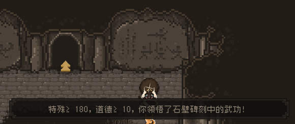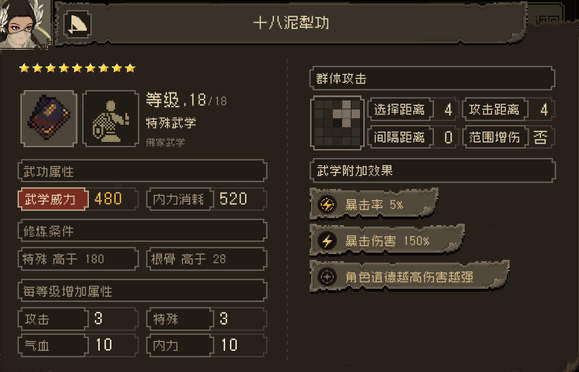 右侧石碑则对应特殊武学【十八泥犁功】,这是一门以大范围AOE闻名的强力技能,其双连击效果和超大范围攻击极大提升了清场效率。想要领悟这门武学,角色的特殊属性需要达到180以上,同时道德值也必须大于10。这种配置更适合专注于特殊武学的玩家,特殊技能点的积累需要通过学习相关秘籍或完成特定任务来提升。十八泥犁功的威力不仅体现在其伤害数值上,更体现在战斗中的实用性,尤其是在面对大量敌人或需要快速解决战斗时,这门武学能提供极大的优势。