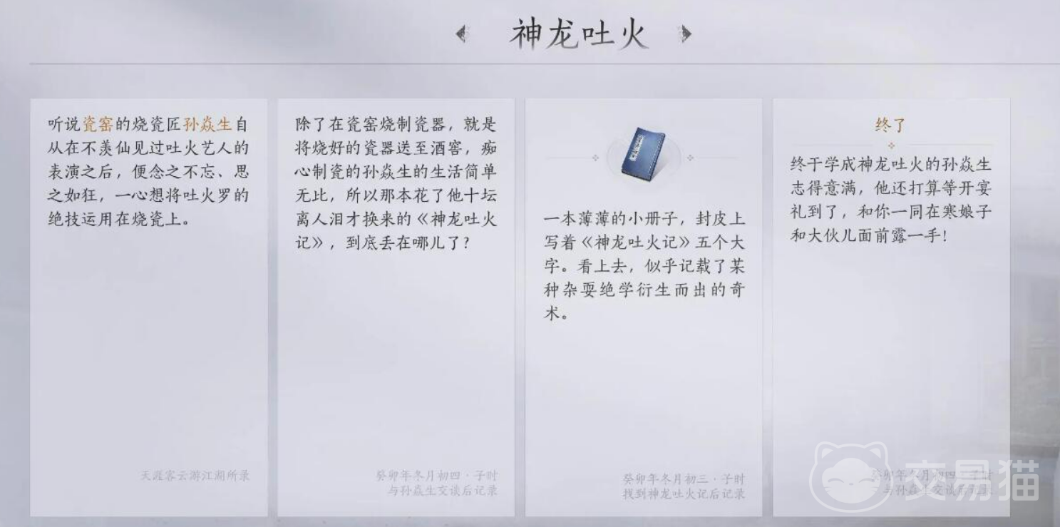 拿到技能书后,我们需要赶紧返回“瓷窑”找孙焱生复命。他会对你表示一番感谢,同时,这一奇术的获取过程也就完美收官了。“神龙吐火”不仅名字霸气,实战中也非常实用,喜欢用奇术打出高爆发的玩家千万别错过。
