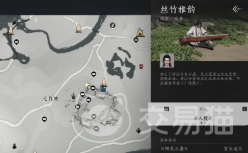 在游戏地图上,玩家会遇到一些以乐器探索玩法,图标通常会在风景优美的地方出现,如山间小亭、湖畔凉亭等。玩家只需靠近这些图标并按下互动键,便能与NPC对话,对话后,NPC会邀请玩家进行丝竹雅韵的挑战。