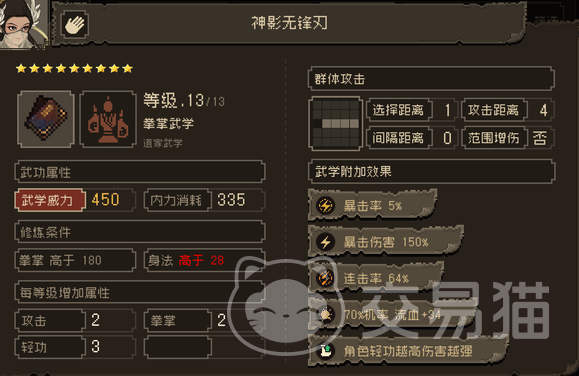 踏上无名岛时,四周的寂静如同一场无声的叩问,岛内的石碑分布隐秘且毫无指引。左侧的石碑,隐约散发出一种锐利的气息,仿佛有无形的拳风在周围游走。这块石碑对应的是拳法秘技【神影无锋刃】。想要解锁这门武学,玩家需要具备拳法属性大于180,身法大于28,且道德高于10的条件。这种苛刻的门槛,将许多初入江湖的侠客拒之门外,当条件达成时,石碑上的文字会忽然生动起来,仿佛有一道无形的拳意从中迸发,直击玩家内心。领悟【神影无锋刃】后,玩家将获得兼具速度与力量的拳法奥义,出手如疾风般迅猛,拳锋所过之处皆是敌人难以招架的虚空。
