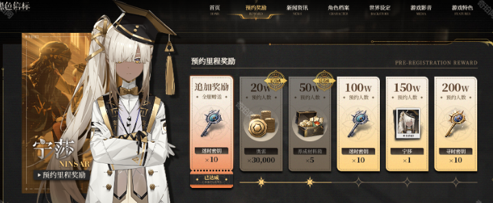 另外玩家在预约时也可以得到奖励,在开局时马上就能获取。如果全服预约早就已经达成相应的里程碑,在游戏一开局时就可以获得对应的奖励。20万预约可以奖励3万个奥雷,50万预约可以奖励5个养成材料。150万个预约就可以获得宁沙奖励。全服追加奖励是10个迷时密钥。