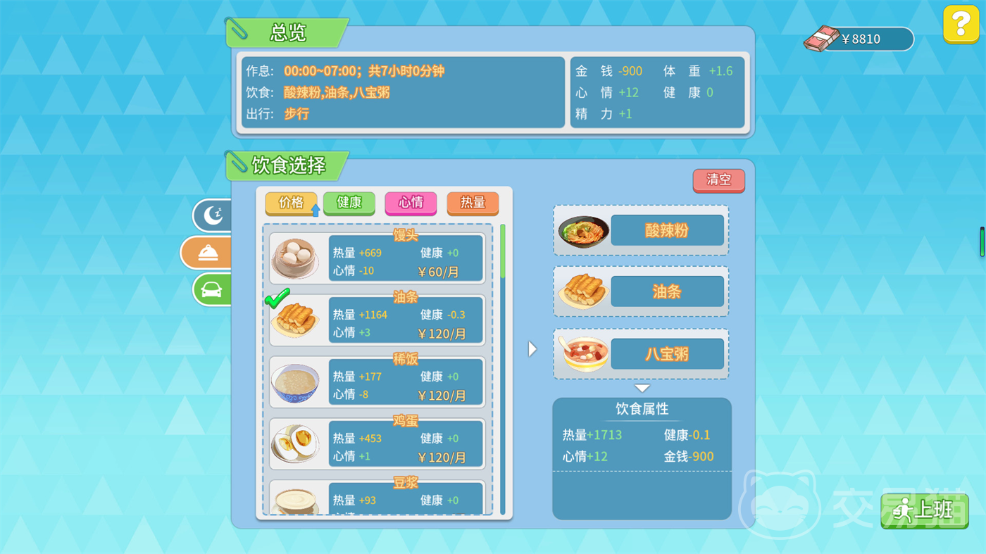 游戏中还有一些细节策略值得注意。租房是玩家生活品质提升的第一步,不仅可以使用房间里的健身设施提升运动力,还能通过娱乐设备增加心情值,从而提高整体生活效率。合理规划饮食和住房支出,避免无意义的高消费,是控制开支的重要环节。同时,保持情绪稳定和身体健康也是游戏成功的关键之一,通过参加娱乐活动或与好友互动可以有效提升心情值,避免因负面状态而造成效率下降。