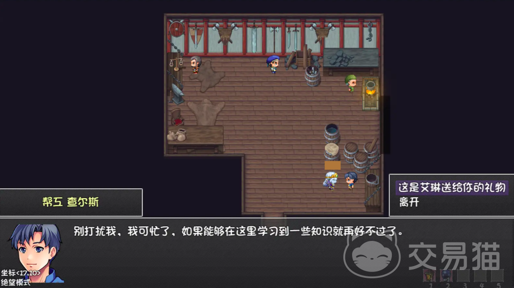 第三个任务内容是礼物的制作与成就任务。此时玩家需要前往(32,12)这个坐标位点上与皮革师艾琳进行对话。开启任务后怒角之角刷本图的boss怒角,可以材料,之后带着这些材料回去和艾琳对话,完成礼物制作,然后再次与他对话,就可以成功开启”艾琳的礼物“。此任务有两个分支分别解锁一个成就,所以在此时千万不要忘了存档。不过前期还有一个非常重要的任务可以帮助玩家解锁艾琳的爱情,玩家可以先去风车村的铁匠铺与查尔斯对话就可以获得这一成就。