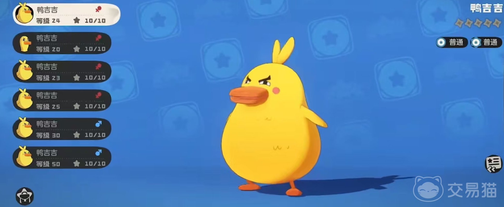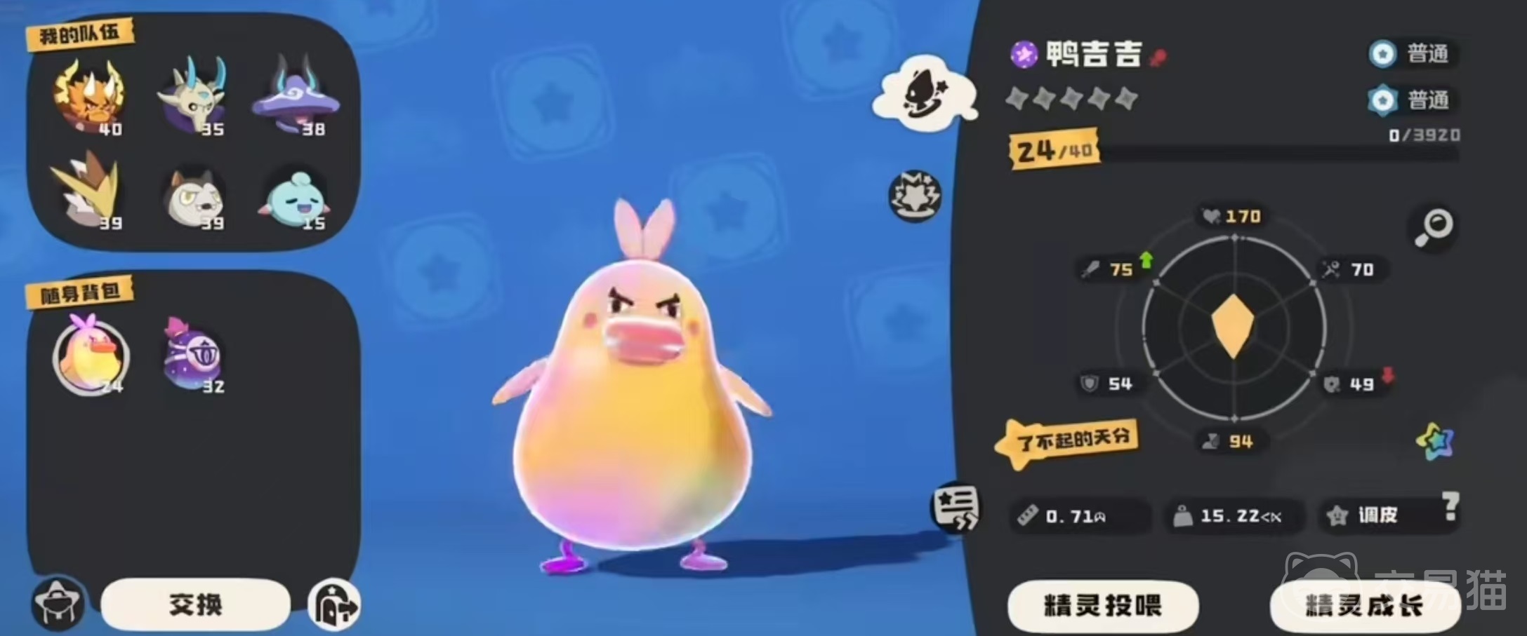 鸭吉吉是属于不会进化的精灵之一,它只有一种形态,身体拥有极其柔软的毛,很讨厌肢体接触,抗拒被抚摸,是一种比较聪慧的物种,对闪光物体和新奇事物格外感兴趣。目前游戏中鸭吉吉一共有三种形态,分别是蓬松的样子,紧实的样子,和急急急鸭,这样的形态设计多了很多趣味性,但是特性都是一样的。它的特性是挺起胸脯,能耗等于1的技能威力都能够提升50%,这个宠物并不算稀有,野外就能直接捕捉到。