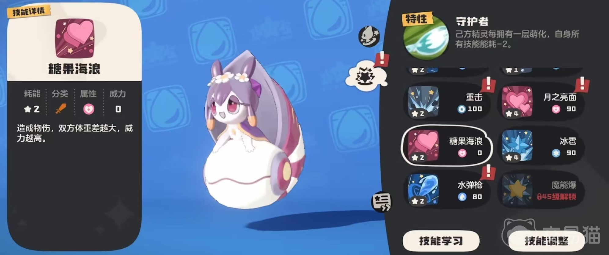 它在战斗中可以使用的输出技能也比较多,小编认为以下几个比较出色。水光冲击,消耗5点能量,魔攻140。月之亮面,消耗4点能量,魔攻90,自身拥有萌化时威力+60。超级糖果,能量消耗2点,物攻125,同时能萌化自身。飞吻,能量消耗2点,魔攻80。糖果海浪,造成物理伤害,双方体重差距越大,威力也就越高。水炮,消耗能量5点,魔攻120,每次释放后,这个技能的能量消耗就能降低一点。