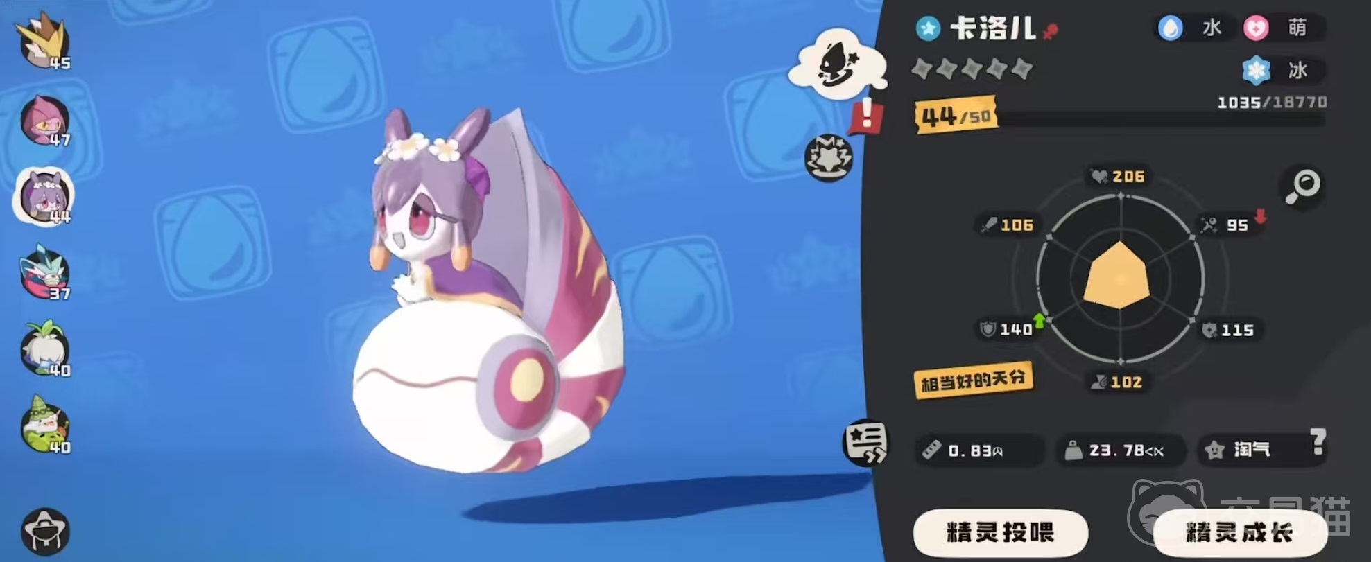 卡洛儿是水属性的精灵,由甜田螺进化到壳乙螺,最后进化成卡洛儿。萌萌的外观非常令人喜爱,它有些呆,给它的东西都会用心的放进自己的壳里,如果和它交流还可以从壳中获得意想不到的东西作为礼物。特性是守护者,己方精灵每拥有1层萌化,自身所有技能能量消耗降低两点。这样在搭配阵容的时候,其实指向就非常明显了,一定要选择那些有萌化状态的来一起出战。