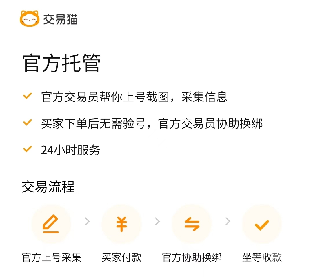 在交易猫上进行账号的交易时,在上架商品时也是非常简单的操作。一般来说,想要上架游戏账号的话,往往会需要玩家进行账号的基础信息等级,账号内道具的截图等等。在交易猫上进行账号商品上架时有一个【官方托管】服务,官方会帮助玩家进行上号截图、采集必要的信息,还会有客服24小时在线帮助买卖双方之间完成账号的换绑,让买卖双方都满意。
