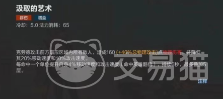 第一项技能是汲取的艺术,在此技能激活时,角色会在其正前方展开一个扇形状的影响区域。一旦敌人踏入这片区域,他们将承受相当于角色60%的物理攻击力伤害。尤为重要的是,若敌人恰好位于该区域的中心地带,他们还将额外受到角色总物理攻击力40%的增幅伤害,并且他们的移动速度会减慢,同时攻击速度也会下降10%。每当此技能成功命中一名敌人,角色的移动速度与攻击速度都将获得小幅提升,最多可提升4%,这种增益效果可累积,持续时间长达6秒,且最多可叠加至五层。