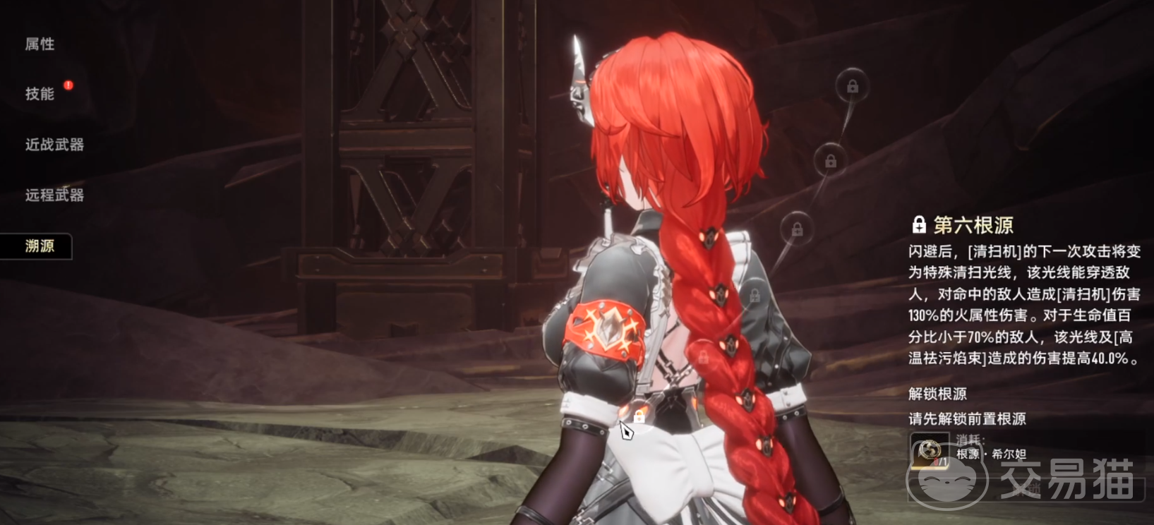第六根源:闪避后,[清扫机]的下一次攻击变为特殊清扫光线,能穿透敌人,对命中的敌人造成130%的火属性伤害。如果敌人生命值低于70%,该光线和[高温祛污焰束]的伤害提高40%。