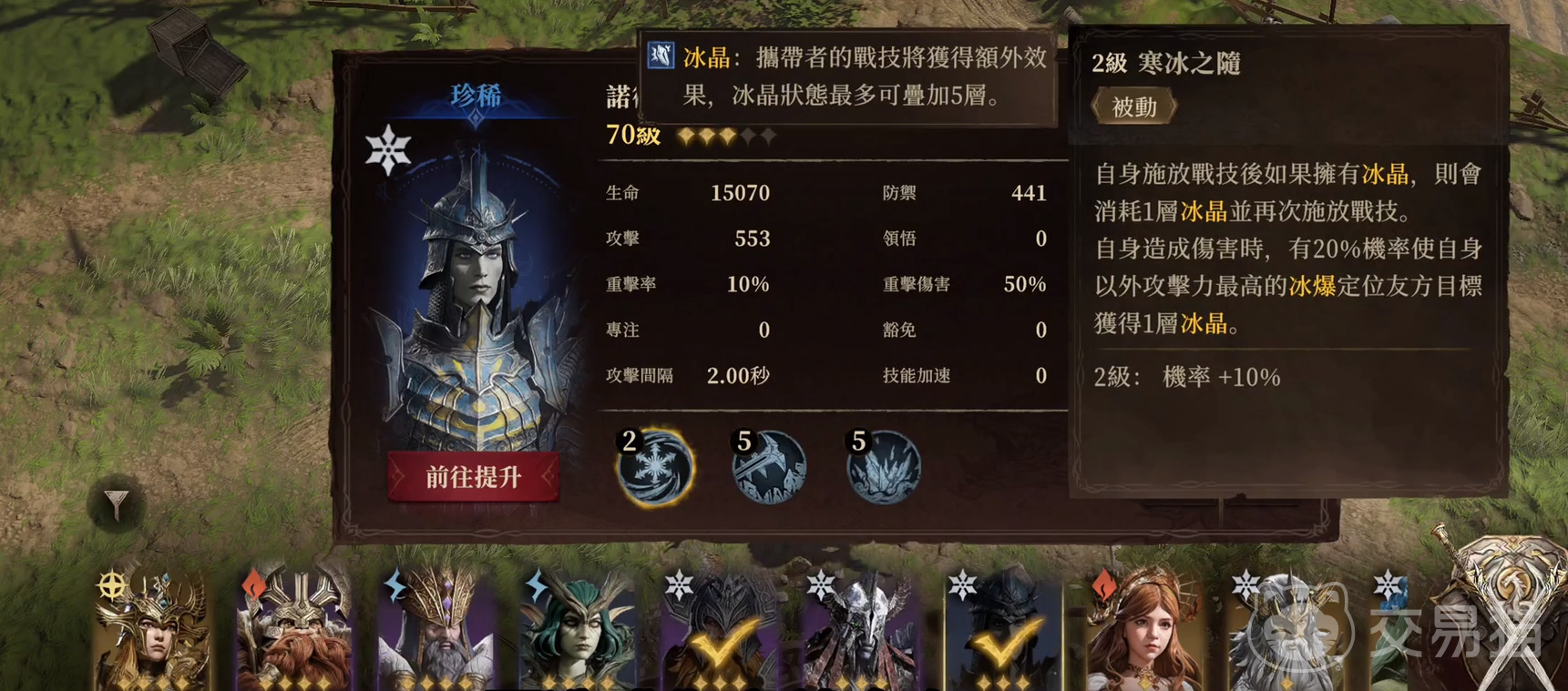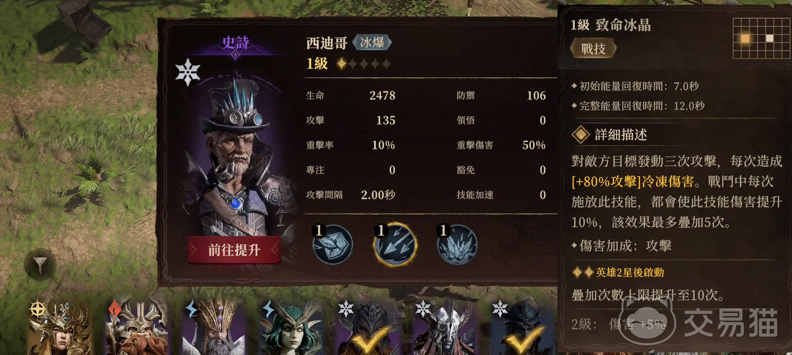 西迪哥:作为紫色稀有英雄,西迪哥在冰爆阵容中非常有价值。他的技能有50%的几率无视敌人30%的防御,适合用来对付盾厚的敌人。西迪哥施放战技后,如果拥有冰晶,会消耗1层冰晶并再次施放战技,增加伤害输出。