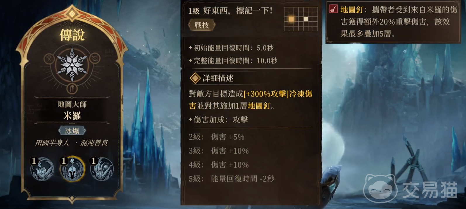 米罗被称为“地图大师”,属于田园半身人,阵容属性为混沌善良。米罗的技能组合非常适合与冰系阵容搭配,能够造成强大的冷冻伤害,并通过“地图钉”这一特色效果提升队伍的输出。下面是米罗的技能介绍: