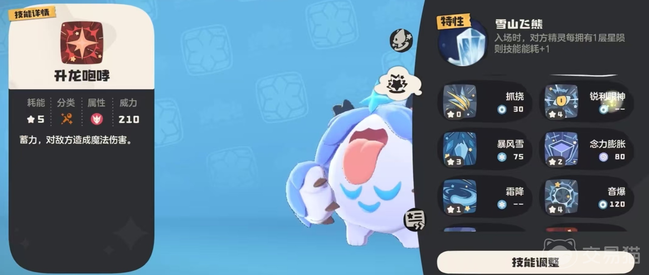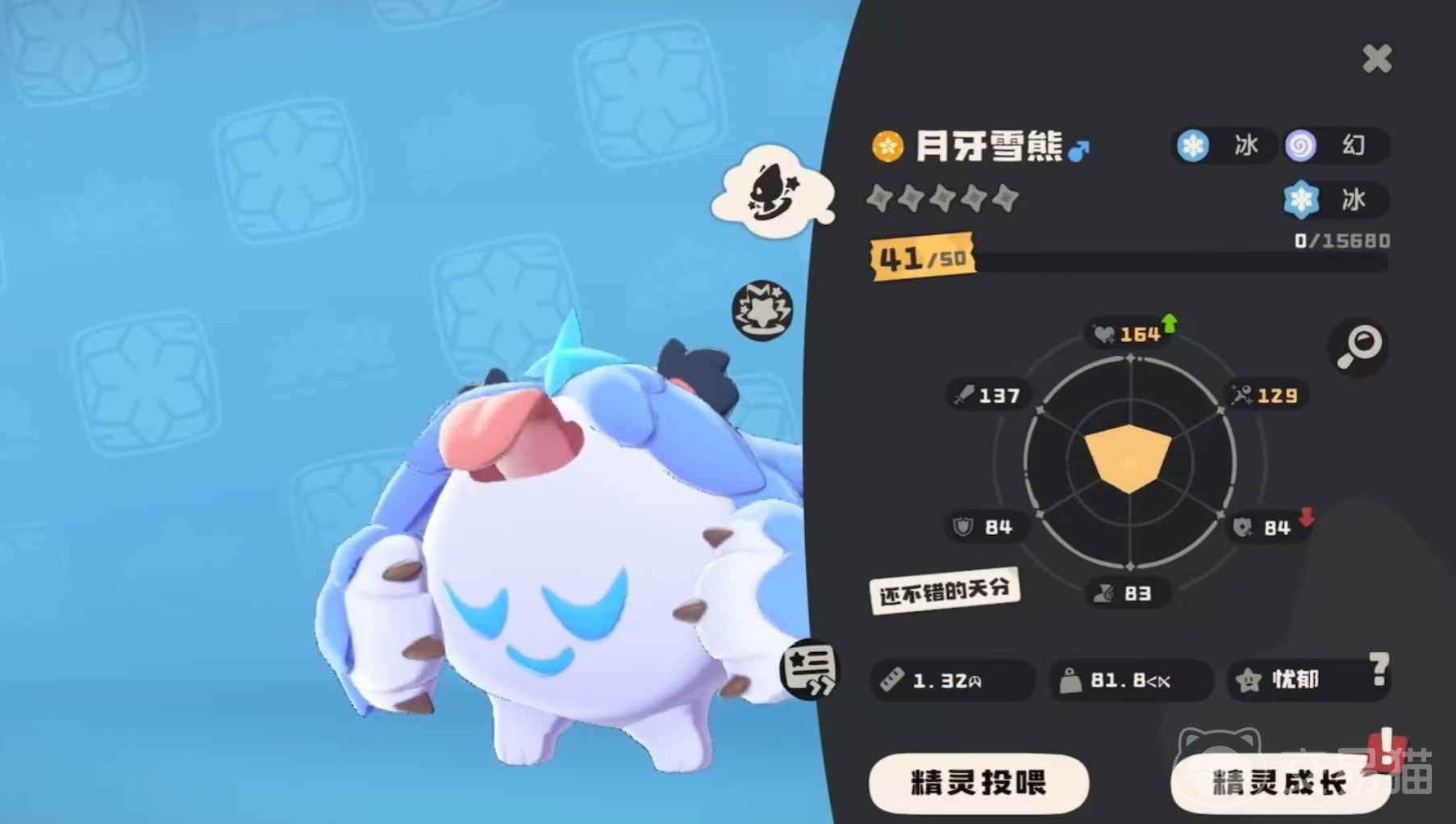 月牙雪熊虽然失去了进化的能力,但是他的星星可以出感温热,从中检测出异常的魔力波动,星星不能离开身体太远,否则就会进入沉睡。自身特性雪山飞熊在入场时对方精灵每拥有一层星陨,则技能消耗加1。这个特性如果能够配合带有星陨的技能使用,那么效果非常出色。使其技能消耗增加,就无法及时开出关键技能了。
