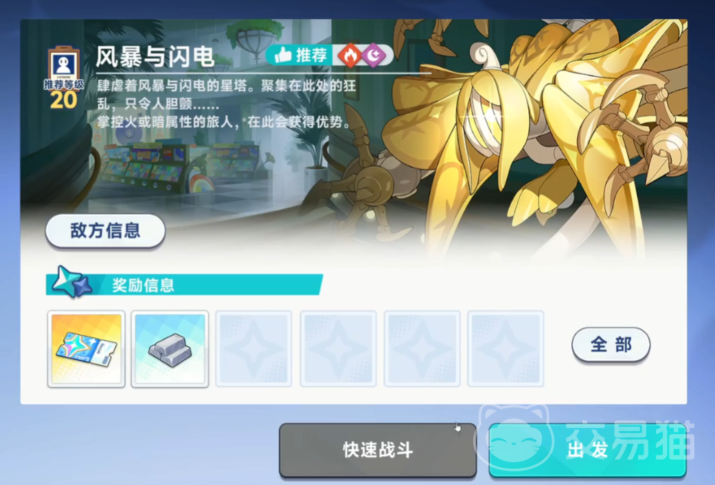 首先风暴与闪电是一个20级的副本,所以大家的全队人员最好都升到这个等级。另外他比较畏惧火属性以及暗属性的角色,所以大家如果条件允许的话可以全部上阵火属性的队员。你就能获得伤害上的优势,即便自己的操作略水,依然有信心过关。