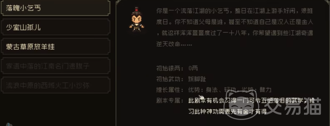 开局可以选择自己的出身,分别是小乞丐、孤儿和放羊娃,小乞丐擅长身法和轻攻,劣势是臂力,选择他有机会学习一门来自西域的邪门外道武学,孤儿的优势的臂力,缺点是身法,选择他能学习一门佛家的武学,最后的放羊娃优势是道德、定力,劣势是悟性,选择他能学习精明但不成方圆的武功;