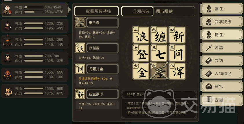 武侠题材的角色扮演游戏里角色往往天赋异禀,各有各的特色,这通常是以“特性”或者标签形式展现的,不同的特性会有不一样的加成,从而提升玩法丰富度。这里就给大家带来大江湖之苍龙与白鸟特性大全,介绍下目前游戏里所包含的特性,大家可以简单了解下。