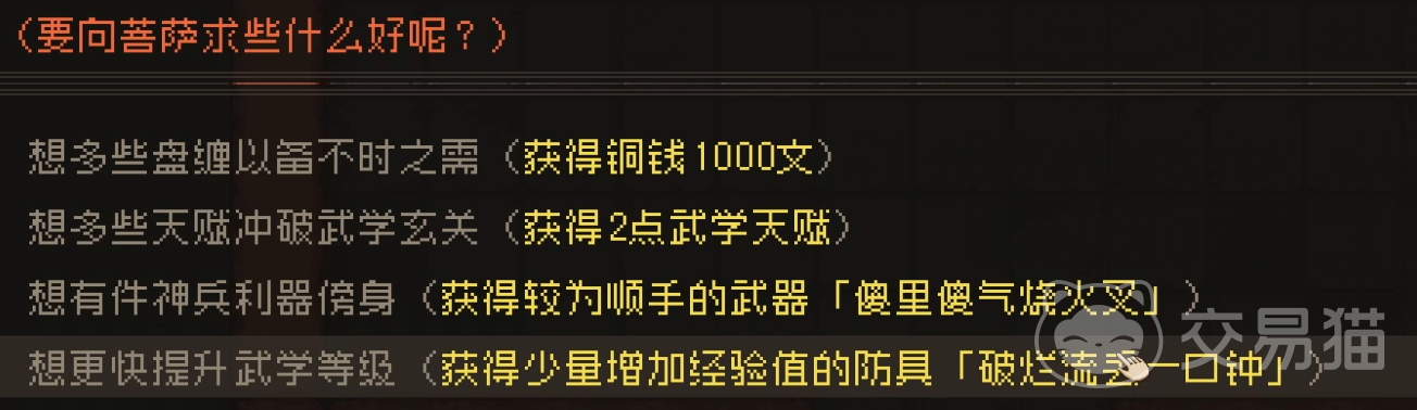 一开始的破庙剧情后咱们和我们的便宜师兄获取到两本秘籍,这两本秘籍之中推荐选择灵狐拳法,这个在初期对于咱们的帮助还是非常大的。在选择好秘籍后咱们先进行学习,之后在破庙里面到处搜查一番,可以找到一些基础的物资。接下来需要和师兄切磋一下,在赢了之后师兄便会离去。接着咱们来到菩萨处进行对话,这里很多玩家有一个误区,再想想这个选项其实是翻下一页而不是结束。咱们点击再想想可以看到新的奖励,这里推荐选择防具,这个防具虽然是一个白装。
