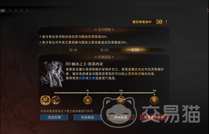 随着这个本难度的提升,BOSS对同属性阵容克制的数值也在不断提升,该BOSS是针对冰黯蚀属性的英雄,也就是说BOSS受到的冰冻伤害和黯蚀伤害会降低30%,而反过来该BOSS对黯蚀英雄和冰元素英雄伤害会提高30%。