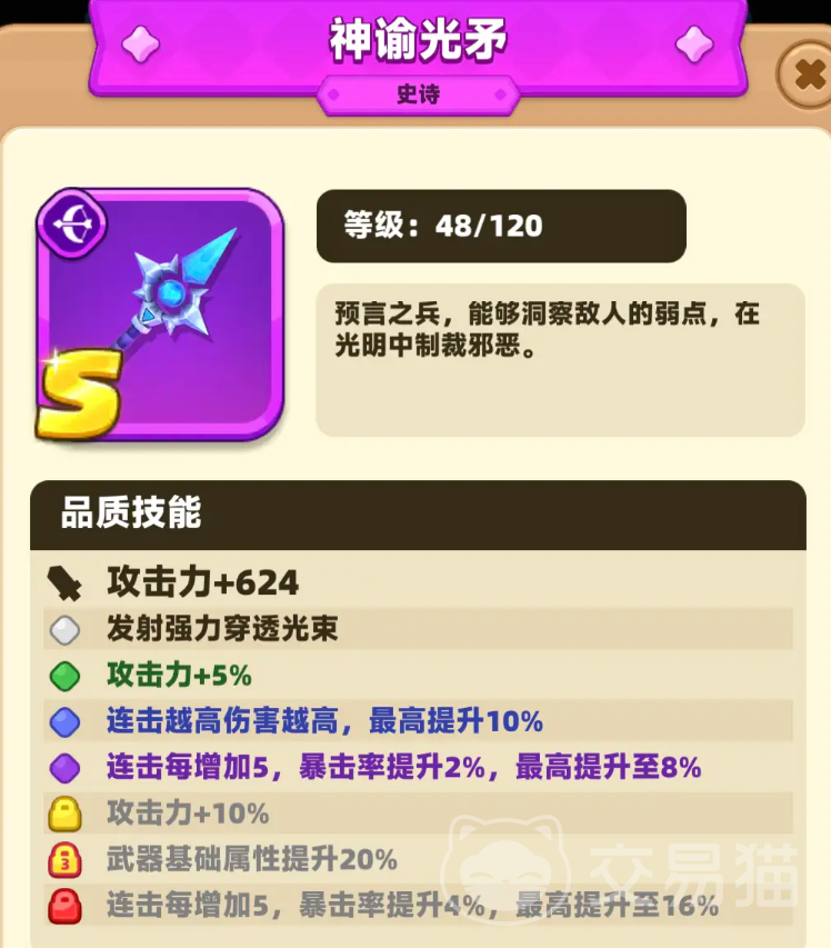 此外,还有一些特有的S级装备,这个要比普通装备更厉害,但是获取难度很高。从紫色品质的装备开始就有装备专属效果了,更多时候玩家是根据效果来攒合适加成的装备。紫色品质以下的装备,每3件同品质的可以合成一个件更高品质的。