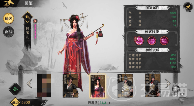 钱玉儿是影卫朱雀堂主,武器是苕华,她因为祖辈的原因,被罚作贱籍,一辈子不能离水而居,于是她加入到了影卫之中,白天她带领一众姐妹白天打渔探听四方的消息,在一颦一笑间就将各种消息源源不断地传回了影卫。