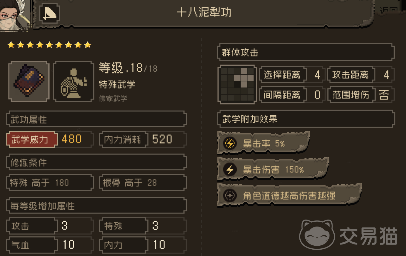 除了前面提到的武功外,这个游戏的武功还有很多,大多是有一些领悟限制的,通常是与武功对应类别的功法属性挂钩,但也有部分与道德、悟性挂钩。