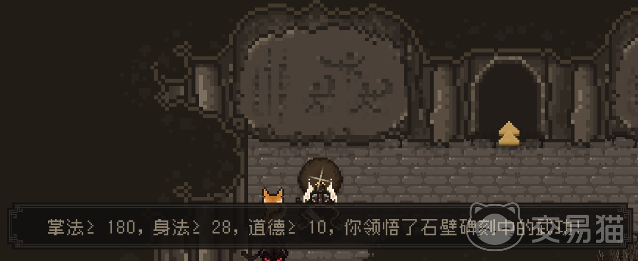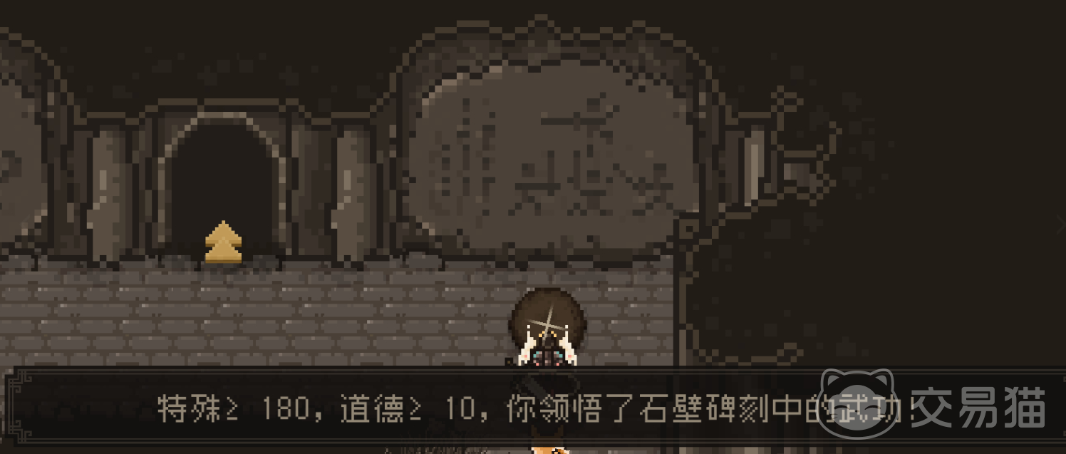 这两块石壁,左边的是拳法,需要拳法大于等于180,悟性大于等于15,而还需要身法有28点才能练,技能范围是一条直线。而右边则是特殊武功,需要特殊属性大于等于180,同时道德属性要大于等于20,是2连击大范围的AOE,伤害很高。