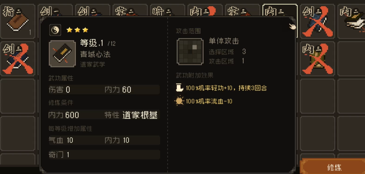 这是一个2级心法武功,需要音律达到40,悟性达到8才能领悟,等级上限12级,因为是心法所以没有伤害,消耗75,习得可以提升10气血10内力3音律,使用的时候可以在1回合内提升自身65的音律。