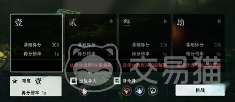 每个章节会包含四个不同的难度,分别是壹、贰、参、劫,玩家在挑战每个章节的时候,可以选择一位异人以及最多3个身外身技能进行出战,每场战斗胜利后,系统会根据难度和通关花费的时间来计算评分,具体来说难度越高花费时间越短,分数就会更高,需要注意大家可以更换三位异人不断挑战,最后分数为三位异人最高分数的总和。