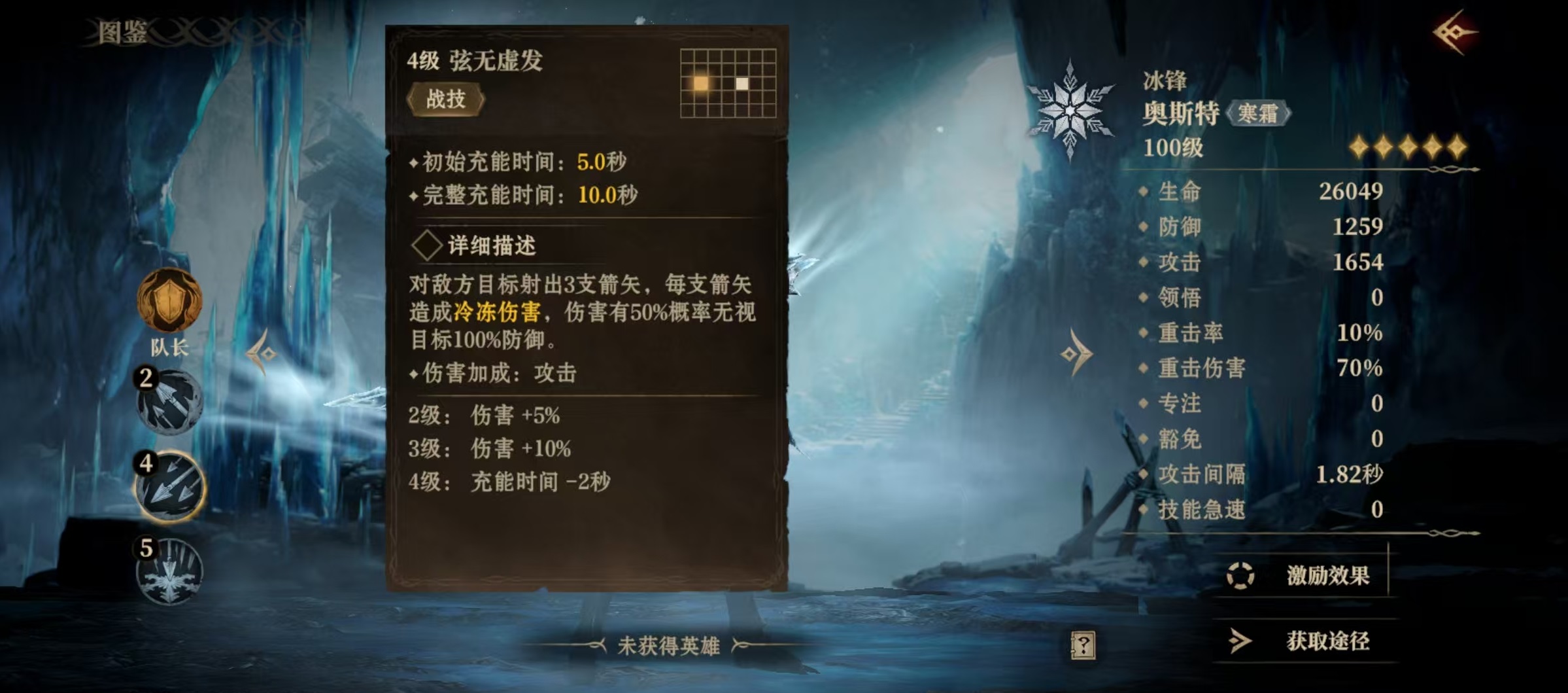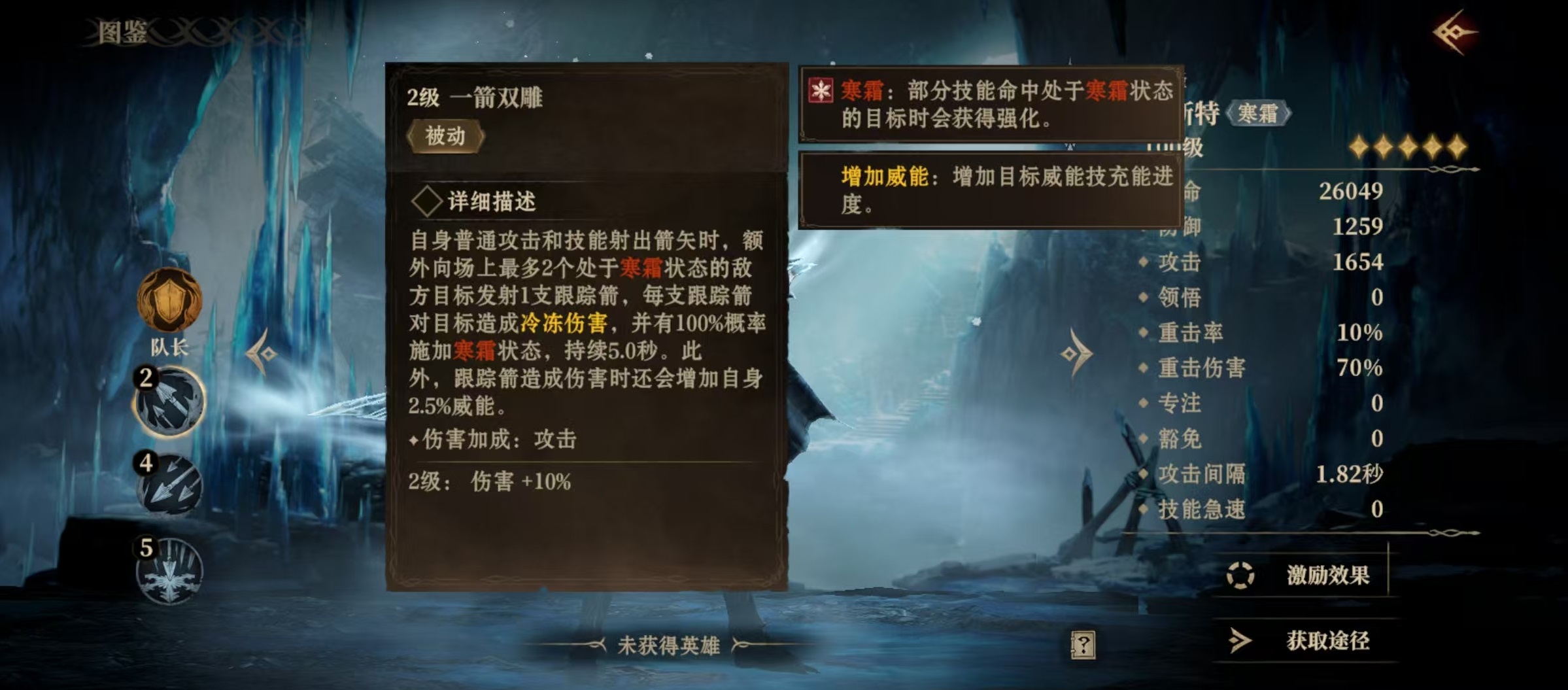 战技弦无虚发,对敌方目标射出三支箭矢,每支箭矢都能造成冷冻伤害,有50%几率无视目标100%防御。这个技能施法距离是比较近的,不过本身就是为了切对方前排而设置,无视防御即使对方肉盾防御较高,也可以打掉非常可观的血量,快速将对方前排清理掉。大招寒风吹彻,这个技能施法范围就比较远了,跳向空中射出蓄力一箭,对大范围内敌方目标造成冷冻伤害,100%几率添加寒霜状态,持续10秒钟。该技能使用后所附带的追踪箭,将对区域内的所有敌方目标发射,并造成更高的伤害。