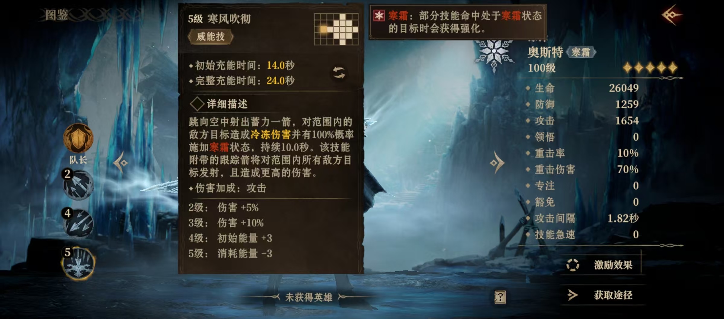 奥斯特具有防御光环的队长技能,只能在历练之域战斗中生效,提升友方目标45%防御属性,提升的比较不错,但适用范围很狭窄,所以一般不会作为队长。被动技能一箭双雕,在自身普通攻击和技能射出箭矢的时候,额外向场上最多两个处于寒霜状态的敌人发射追踪箭,每支箭都能造成冷冻伤害,并有100%几率施加寒霜状态,持续5秒钟。另外追踪箭造成的伤害还会增加自身2.5%威能。这就是一个依靠队友或自身打出寒霜状态后,才能更好发挥的被动。