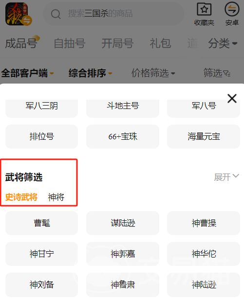 另外商品中有一些强大的武将可供我们挑选,这时候我们只需要在筛选栏目中直接勾选一个我们需要的武将。如何挑出拥有该武将的相应账号,所以对于喜爱某些武将的朋友来说,而且选一个更适合高性价比号,如此就可以以他为核心打造队伍。