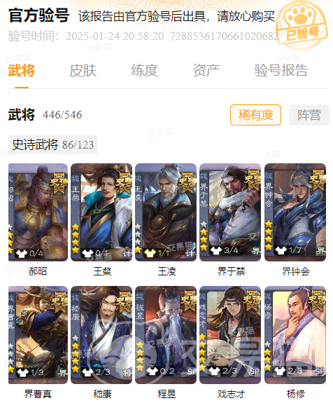 许多新玩家想入坑三国杀,但却不知道三国杀账号去哪买好?毕竟该游戏已经出了很久了,如果没有买号的话就很难跟得上其他人的节奏,自己也没有时间和金钱去购买如此多的卡牌。所以我们可以前往交易猫中,可随心挑选你所需要的三国杀账号,从而满足你的各方面需求。