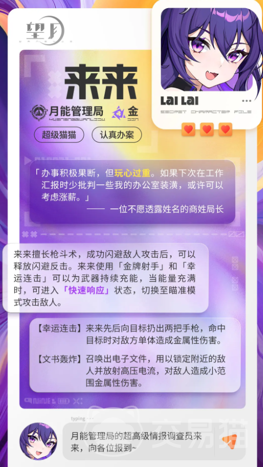 来来是《望月》中的一位神秘人物,具有悠久的历史和复杂的背景。她的身世充满了谜团,外表看似天真无邪,实则内心深藏着众多未解之谜。她并非普通的人类,而是一个由特殊力量孕育出的存在,拥有强大的能力和独特的精神体。来来在游戏中的出现,标志着玩家将进入一个全新的冒险篇章。在《望月》的剧情中,来来与月灵系统有着密切的关系。她既是月灵的“守护者”,也承载着某种神秘使命。随着剧情的推进,玩家将逐步揭开来来背后的真相,并通过与她的互动,体验一段充满挑战与感动的故事。