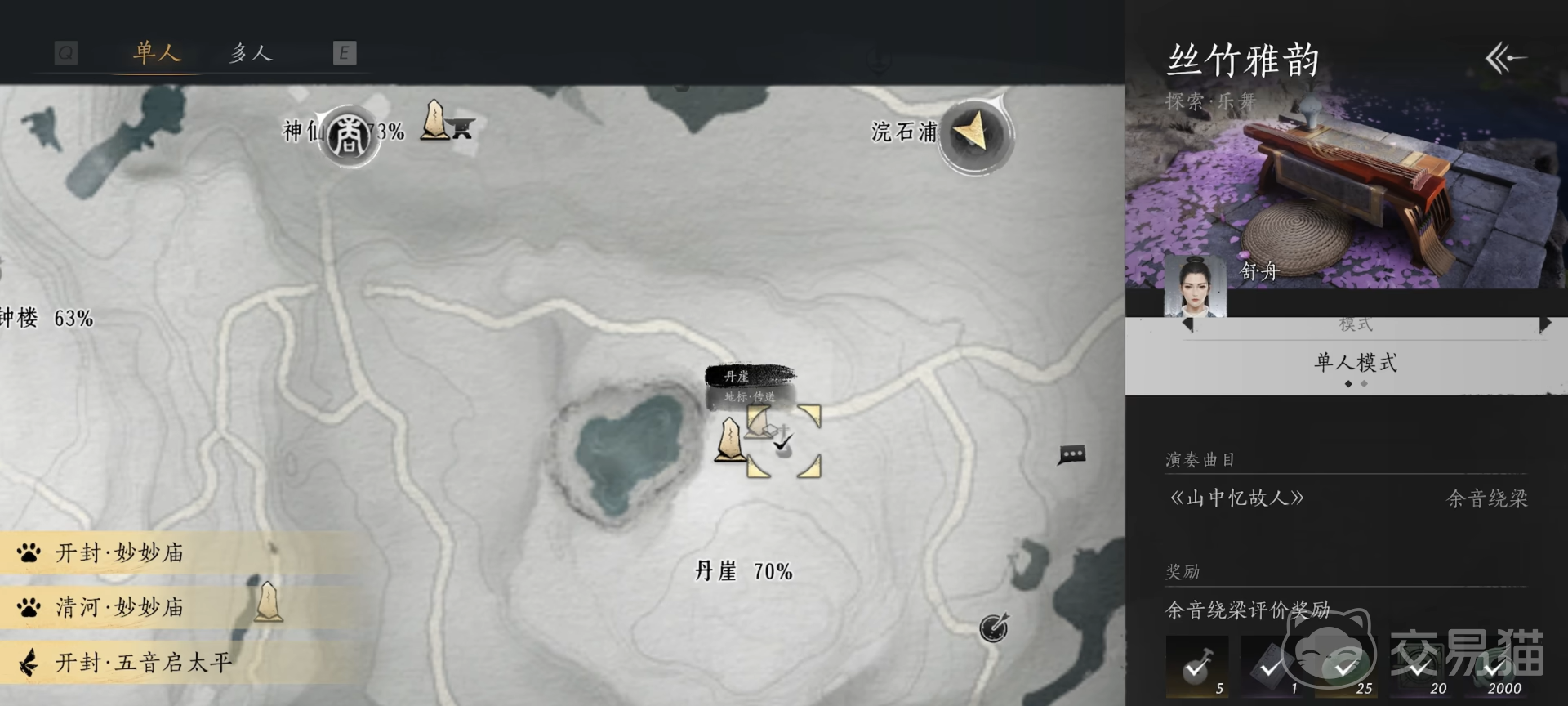 在游戏中,想要解锁古琴,关键在于收集几首特定曲子的乐谱。这些乐谱分别对应不同的地点与任务,需要玩家通过细心探索与一系列的演奏任务来完成。首先,在丹崖传送点附近,玩家需要找到NPC舒舟,完成她的演奏任务《山中忆故人》。当演奏结束后,就能获得第一张乐谱。这段任务简单易上手,只需根据指引找到正确的位置即可。