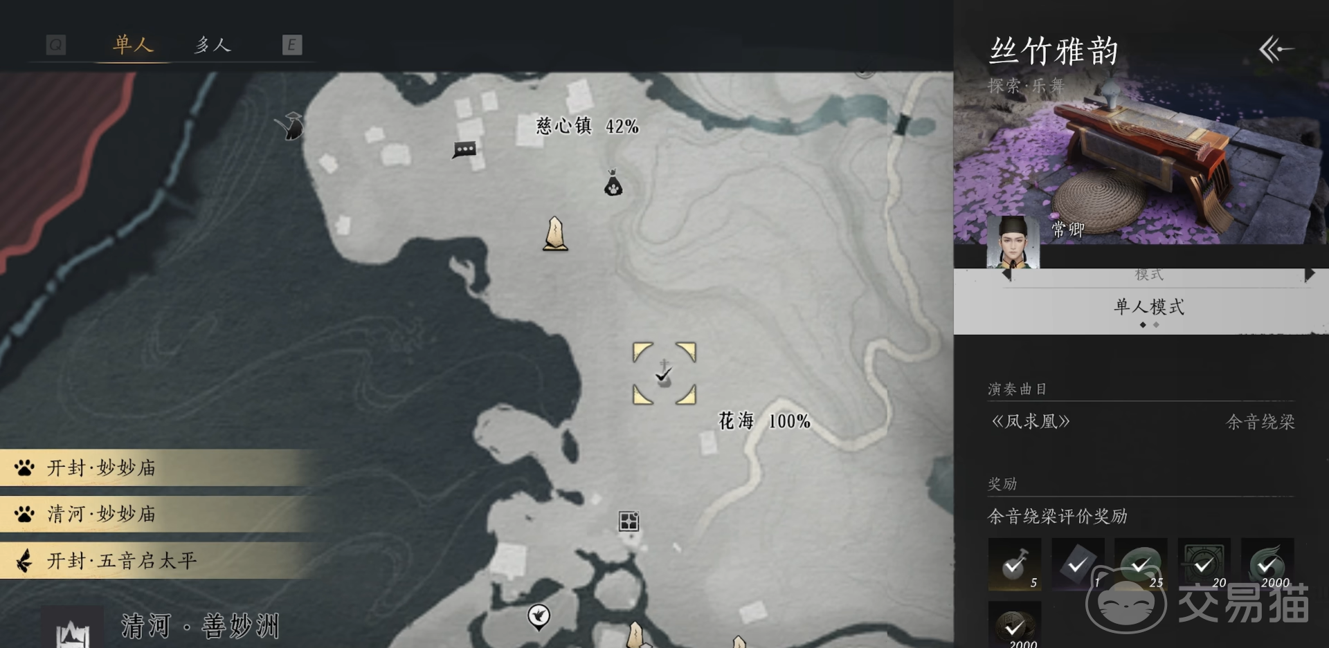 第三张乐谱的获取地点位于花海,具体位置是在慈心镇和不羡仙传送点之间。各位小伙伴在那边需要找到NPC常青,同时也需要按照他的要求完成他的演奏任务《凤求凰》。由于该区域的景色十分优美,小编建议大家可以稍作停留一下,欣赏一下游戏中的风景,感受那份浓厚的江湖韵味。等到成功完成演奏任务之后,这张乐谱便可以轻松送给各位小伙伴了。