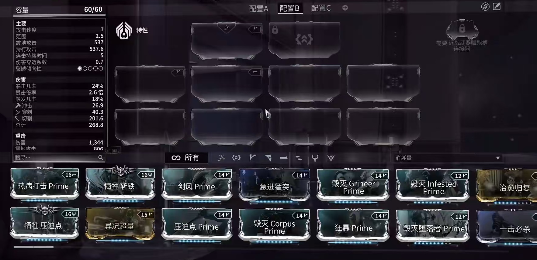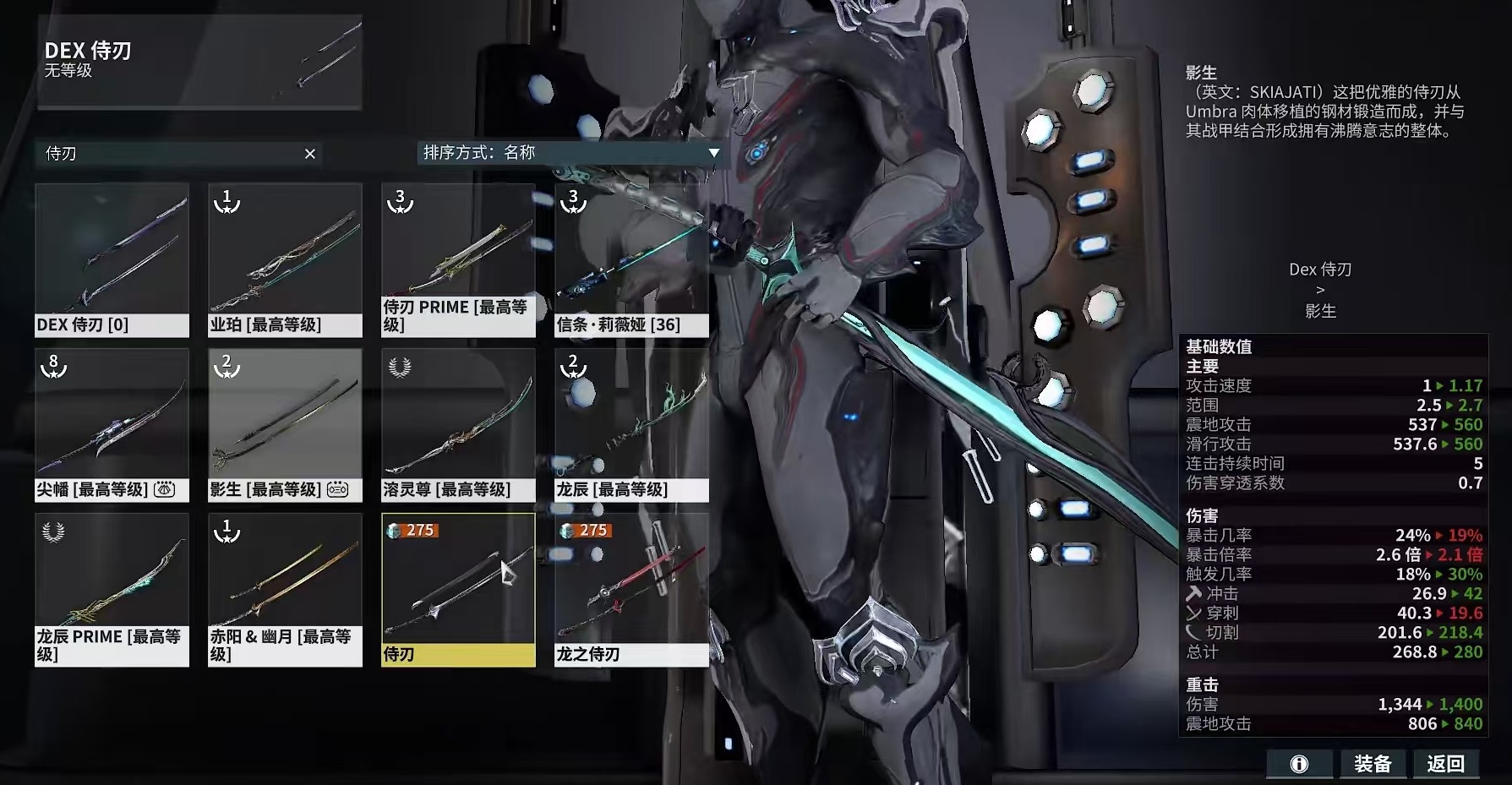 侍刃这一类型的武器虽然有着多种不同的版本,但是都有一样的基础特点,那就是基础伤害比较出色,攻击速度较快,攻击范围适中,有较好暴击几率和触发几率数值。在使用方面,推荐大家选择致命打击、削弱、毁灭等mod,这样做的目的是提升暴击几率,暴击倍数以及伤害和穿甲效果,达到高输出的目的。也可以选择兼顾暴击和攻速的流派,提升了攻速,暴击率和暴击伤害后,在实战中也有很好的强度。