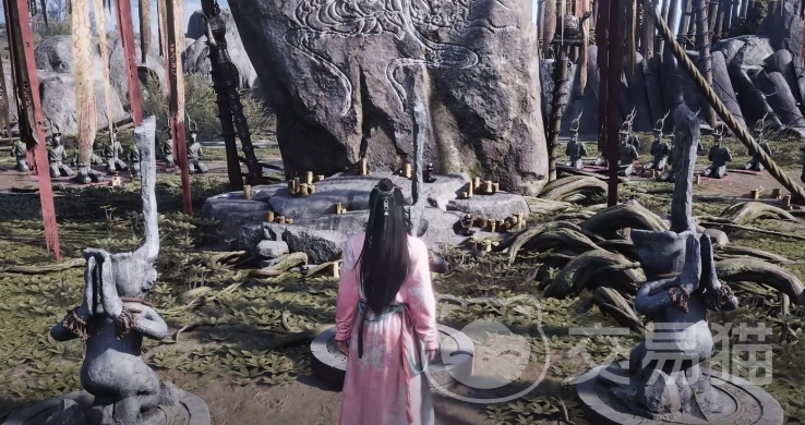 此时大家需去查看跪着的石人,然后在空坐垫处跪下模仿,多坐一会儿直到看到鹿影的出现,此时玩家就能去主动跟随鹿影脚印前进,途中会看到一男一女的幻影,大家需要做的就是去留意他们之间的对话。