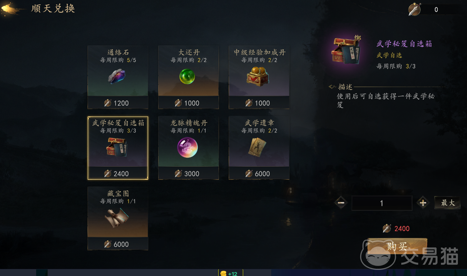 杂货铺中的秘籍是每周回上架4本,绑定元宝可以购买1本,花费顺天币可以每周买3本,3本秘籍总共要2400顺天币。