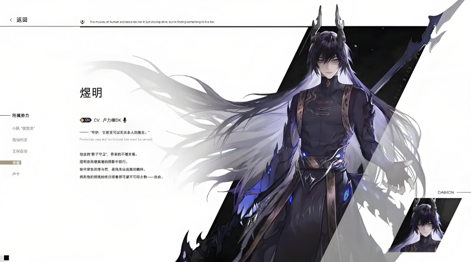 煜明这个男人角色是我们在游戏中战斗时可以使用的角色,这个角色也被称之为无罪囚徒,游戏里面对煜明这个给角色的造型也进行了相当精致的设计,一双忧郁的眼眸给人一种他总是有心事的感觉,黑色的长发上长着一对黑色的长角,纯黑色的服饰显得煜明更加的神秘不已。
