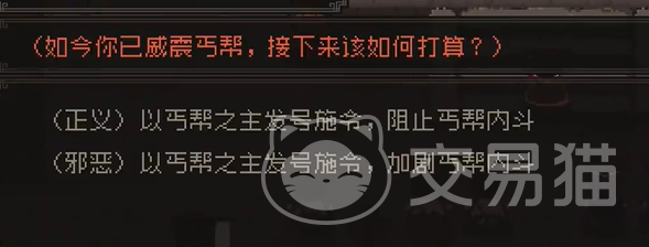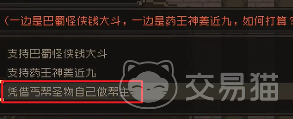 对话有多少个选项,有支持巴蜀怪侠钱大斗的,有支持药王神姜近九的,还有凭借着丐帮圣物自己做帮助,这里选自己做帮助。虽然有圣物在身,但还是要靠实力说话,仍然会触发战斗。