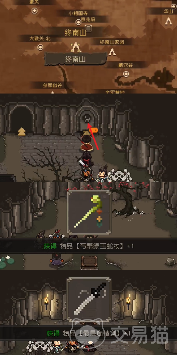 之后是前往“终南山”,在右侧有一个密室,密室的门上有“两仪”图案,还是比较好认的,进入密室搜索可以找到“丐帮绿玉蛇杖”,还有一把“最是痴情剑。