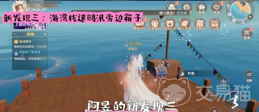 阿昱的第3个发现其实也是箱子,不过这个箱子在海湾栈道欧讯旁边,玩家需要去海湾栈道,然后再找到欧讯旁边的箱子,再直接把那个箱子打开,这时候玩家就可以发现第3个任务已经完成。当玩家找到了三个发现之后代表玩家就已经完成了任务,这时候玩家将会获得金币,经验值,道具等等丰厚的奖励。
